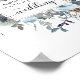 Sinal de boas-vindas do Elegant Wedding com um belo buquê floral com noiva e nomes de noivo. 8" x 10" é simplesmente um exemplo, a capacidade de escolher tamanhos cada vez maiores e menores. Folhagem e flores em azul, marinho, branco, cinzas, sábio e caramelo empoeirados. "Casamento" na caligrafia graciosa moderna. Fácil de enquadrar ou, em alternativa, colar/grampear para suportar MDF barato. Parte do nosso casamento e da coleção de eventos "Montanhas Azuis Russas".