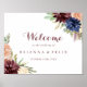 Este ouro rústico deixa o sinal de boas-vindas florais para o casamento é perfeito para um casamento simples. O design apresenta uma aquarela desenhada à mão, púrpura, marinho, pincel, burgundy, flores marinhos, folhas verdes e douradas que adornam uma elegante moldura geométrica. Faça esta poster com o nome da noiva e do noivo, e a data do casamento.
