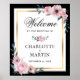 Bem-vindos aos seus convidados à sua elegante festa de casamento com este sinal floral de boas-vindas. Itens de correspondência disponíveis para complementar este sinal de boas-vindas ao casamento floral preto e esbranquiçado com flores cor-de-rosa embaçadas e verde em volta dos detalhes do casamento dentro uma estrutura dourada com fundo preto. Personalize facilmente esta placa floral com os seus detalhes de casamento.