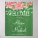 Poster de placa de casamento chic e clássico com peônias rosadas rústicas e cordas de luz cintilantes em madeira verde brilhante. Ideal para o seu verão primavera | jardim | outono | Casamento temático de quintal russo do exterior.