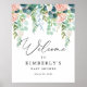 Bem-vindos aos convidados do chá de fraldas com o nosso cartaz do jardim, com cor d'água verde e eucalipto. Personalize com seus detalhes de chá de fraldas em um layout simples e moderno e uma fonte elegante de estilo manuscrito.