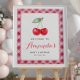 Um bom sinal de boas-vindas a um chá de fraldas, com tema cereja, com duas cerejas aquáticas enquadradas por uma borda cor-de-gingham rosa. Personalize com o nome do convidado de honra e a data do evento. Perfeito para cumprimentar convidados e amarrar seu tema de festa de cereja juntos.
