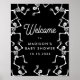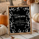 Bem-vindos convidados em estilo assustador com este poster de sinal de boas-vindas do chá de fraldas no tema do Dia das Bruxas, com um guião branco ousado "Bem-vindo" com o nome da futura mãe e a data do chá mostrados abaixo. Cercado por esqueletos brincalhões de dança em um fundo preto, este design dá o tom para uma celebração gótica festiva ou inspirada no Halloween. Disponível como poster impresso, download digital ou ambos, é perfeito para exibição na entrada do seu local e combina perfeitamente com a decoração de chá de fraldas com o esqueleto correspondente para criar uma primeira impressão memorável.