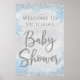 O chá de fraldas da Maravilha de inverno é bem-vindo com bonito letras prateadas em um fundo azul prateado floco de neve. Este cartaz de boas-vindas do chá de fraldas floco de neve do inverno é facilmente personalizado para o seu evento simplesmente adicionando seus detalhes.
