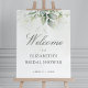 Lindo sinal de boas-vindas do chá de noiva com eucalipto em aquarela e folhas de ouro.