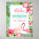 O sinal de boas-vindas / pôster do chá de noiva apresenta dois lindos flamingos rosa com uma moldura exuberante de folhas de palmeira verdes e flores de hibisco tropicais em tons de rosa quente, amarelo ensolarado e branco. O texto estiloso Aloha com o título do banner azul aqua pode ser totalmente personalizado para o seu evento e o nome da futura noiva. A cor do fundo é azul / verde marinho.