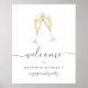 Sinal de boas-vindas festivo e elegante para sua festa de noivado ou casamento mostra um par de copos de champanhe em água, cheios de espuma. Personalize com três linhas de texto personalizado abaixo; mostradas com "boas-vindas" e os nomes de casais e o tipo de evento.