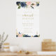 Este sinal de boas-vindas do janto de ensaio de ouro floral é perfeito para um ensaio de casamento rústico. A design apresenta belas flores azuis escuras pintadas manualmente, azuis, marinhos, rosa, pinceladas, douradas e folhagem verde.