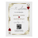 Design elegante com código QR para que seus convidados possam ver o programa de cerimônia de casamento. Apresenta caligrafia moderna, estrutura de Deco de Arte Dourada, corações vermelhos, Q e K como em cartas de jogar que podem ser substituídas por iniciais de Noiva e Groom. Use a ferramenta Personalizar para adicionar suas informações. Visite minha Dourada Coleção de Arte Casino.