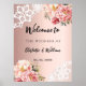 Bem-vindos a um casamento elegante e romântico. Um fundo rosa de ouro-chic. Decorado com flores, rosas e rendas brancas cor-de-rosa. Personalize e adicione os nomes da noiva e do noivo e um encontro.