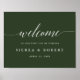 Poster de Boas-vindas com texto moderno. A palavra "bem-vindo" não pode ser editada, mas pode ser redimensionada para ajustado tamanho do seu poster. Todos os outros textos podem ser totalmente editados. Mostrado com fundo verde de caçador. Escolha qualquer cor de fundo para coordenar com as cores do seu casamento.