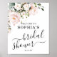 Sinal de boas-vindas para chá de noiva apresenta rosa cor-de-rosa aguada enrubescida com folhagens. Tipografia cursiva e clássica utilizada.