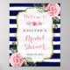 Sinal de Boas Vindas para Chá de Noiva com Faixa Naval Floral Rosa com Moldura de Brilho Dourado.