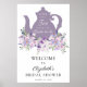 Dê as boas-vindas aos convidados para o seu chá de noiva com este belo cartaz, apresentando um bule de chá de lavanda roxa com flores roxas e rosadas com folhagens. Adicione o nome da convidada de honra, data do chá e texto de boas-vindas personalizado usando os campos fornecidos.