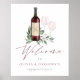 Este elegante letreiro temático de degustação de vinhos é a maneira perfeita de dar boas-vindas aos convidados para o chá de noiva, festa de noivado, casamento ou jantar de ensaio realizado em uma vinícola, sala de degustação ou vinhedo. O design apresenta uma garrafa de vinho tinto burgundy e duas taças de vinho adornadas com folhas de eucalipto e folhagens em aquarela verde. "Boas-vindas" aparece em letras de caligrafia sofisticada, com duas linhas de texto personalizado para o nome do evento e convidado(s) de honra. Para um toque final, personalize o rótulo da garrafa de vinho com as iniciais do casal.