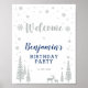 Este sinal de boas-vindas para festa de aniversário no inverno apresenta flocos de neve fofos e texto em letra cursiva com textura de brilho prateado. Perfeito para uma festa de aniversário com tema de inverno para o seu menino!
