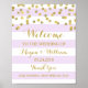 Bem-vindo ao poster de sinal de casamento com nome personalizado e data em padrão de listras roxas e brancas de lavanda clara com o efeito de brilho dourado confetti, por favor note que ouro é apenas efeito fotográfico.