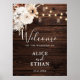 Elegância encontra encanto rústico com nossa placa de casamento encantadora, uma fusão impressionante de beleza inspirada na natureza e romance moderno. Este cartaz cativante define o tom para o seu dia especial com seu delicado buquê botânico de flores em queda e folhas secas de palma delicadamente arrumadas. Contra um pano de fundo da madeira rústica, é uma obra de arte que convida seus convidados para um mundo de calor e amor.