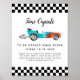 Sinal divertido e bonito para a festa de aniversário do tema do carro de corrida do seu filho! É um sinal de poster de cápsula do tempo para uma atividade de aniversário para escrever uma memória ou esperança para o aniversariante para que ele possa abri-los e lê-los quando completar 18 anos. Apresenta a ilustração de um carro rápido azul com a arte da chama vermelha.
