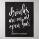 Um sinal de casamento elegante e moderno, apresenta o texto "As bebidas são por nossa conta! Barra Aberta" em uma fonte de letra manuscrita extrovertida, a textura da pincelada adiciona um sentimento espontâneo e divertido. A cor do fundo pode ser personalizada de acordo com suas necessidades e preferências, por favor entre em contato comigo se tiver alguma solicitação especial.
