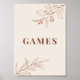 Os sinais de jogos são caracterizados por um estilo "boho" com trabalho de arte floral e cores verdes e beges neutras.