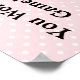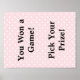 Você ganhou um jogo, escolha um prêmio! É o que diz este cartaz. Bom para jogos de chá de fraldas, casamento ou jogos de festa. Rosa com bolinhas brancas.