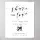 Sinal de código QR de casamento personalizado com design de caligrafia moderna em preto e branco 'Compartilhe o Amor'.