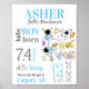 O sinal de estatísticas de nascimento de bebê no Espaço Azul inclui todas as informações de nascimento, incluindo data, hora de nascimento, peso e local de nascimento. Inclui astronautas e foguetes espaciais ilustrados.