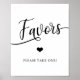 Design simplesmente elegante em letras de topografia em preto e fundo branco e letras pretas. Pequeno coração no meio. Sinal de FAVORES para chá de noiva ou casamento para qualquer época do ano ou tema. Coloque o sinal na mesa onde os presentes dos convidados podem levar um na entrada ou quando saírem