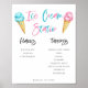 Sinal de menu divertido de estação de sorvete para sua festa de revelação de gênero com ilustração de aquarela de sorvetes rosa e azul em cones de waffle. Você pode listar seus próprios sabores e coberturas.