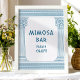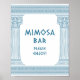 Sinal de mesa 'Mimosa bar, por favor aproveite' para festa elegante com toga, apresentando pilares de templo elegantes e padrão de meandro grego em azul. Perfeito para seus casamentos, noivados, festas de formatura, aniversários, save the dates, despedidas de solteira e festas de aniversário temáticos da Grécia Antiga ou Roma Antiga.