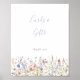 Este verão, cartões multicolores de flor silvestre e sinal de presentes é perfeito para um casamento ou chá de panela moderno. O design apresenta uma coloração aquosa, rosa, púrpura, vermelha, burgundy, amarela, flores brancas e borboletas, com vegetação nebulosamente embebida em buquês florais elegantes. Faça a linha de texto na parte inferior da placa sua incluindo a data, os nomes da noiva e do noivo ou uma mensagem curta como "Obrigado". Esta placa pode elogiar um casamento, qualquer evento ou festa.