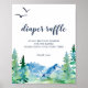 Este cartaz de fralda de montanha rochosa é perfeito para um chá de fraldas externo. O design apresenta uma paisagem de natureza selvagem pintada, azul e verde, com pinheiros de aquarela, pássaros e montanhas.