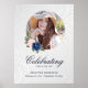 Elegante sinal de boas-vindas memorial/funeral floral prateado com uma foto adornada com rosas azuis e rosadas de aquarela e flores de respiração de bebê em um fundo prateado com padrão botânico.