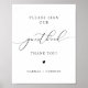 Este modelo de "por favor assine nosso livro de convidados" apresenta uma fonte elegante e design minimalista moderna. A elegante combinação de cores preto e branco faz dela a adição perfeita a qualquer evento. Use este poster para sua recepção de casamento, chá de panela, chá de casais, etc.