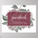 Projetado para combinar com a nossa coleção de casamento do Jardim Inglês em Marsala, este elegante cartaz floral convida convidados para o casamento a assinarem o seu livro de convidados. Personalize com duas linhas de texto personalizado no roteiro de caligrafia e na letra serif tradicional (mostrada com "Guestbook; por favor, deixe seus desejos para o novo Sr. e Sra. [nome]"), sobreposta a um elemento de corante burgundy marsala, com flores de pânico rosa-pinto-pinto-cinzento e verde-sábio a espiar-se.