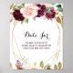 Este sinal de jarra de data floral burgundy verde geométrica dourada é perfeito para um casamento rústico. O design apresenta elegantes ramalhetes de flores desenhadas à mão em verde, rosa, roxo, vermelho e burgundy, adornando molduras geométricas douradas, inspirando classe e beleza.