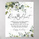 O design apresenta folhagem mista em aquarela que consiste em eucalipto, ramos de oliveira botânicos e mais. A folhagem é estilizada em vários tons de sage, esmeralda e verde claro. Você pode alterar o texto se desejar mudar as regras para este jogo de chuveiro de noiva.