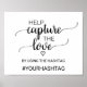 Este sinal de letra cursiva preta "capture o amor" é perfeito para um casamento rústico. O design minimalista apresenta uma fonte de pincel elegante e um coração feminino encantador. O sinal lê "ajude a capturar o amor usando a hashtag: sua hashtag".