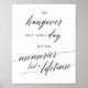 Este pôster de letra de caligrafia preta elegante de ressaca e memórias é perfeito para um casamento simples. O sinal diz "a ressaca dura apenas um dia, mas as memórias duram uma vida inteira". O design neutro apresenta um pôster minimalista decorado com tipografia romântica e caprichosa.