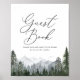 Peça que amigos e familiares assinem seu livro de hóspedes com este cartaz elegante, com montanhas de aquarelas e pinheiros.