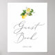 Este sinal de livro de hóspedes de jardim de limão moderno é perfeito para um casamento de primavera ou verão. O design rústico mediterrâneo apresenta limões em aquarela brilhantes e bonitos com flores brancas boêmias e folhas verdes elegantes.