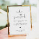 Este sinal de livro de visitas de áudio apresenta um design minimalista moderno e uma fonte manuscrita edgy. A simples combinação de cores preto e branco torna-o a adição perfeita para qualquer evento. Use este pôster para sua recepção de casamento, chá de noiva, festa de aposentadoria, etc. Edite *maioria* das palavras para atender às suas necessidades.
