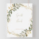 Este sinal de livro de visitas de outono com folhas e dourado geométrico é perfeito para um casamento moderno ou chá de noiva. O design apresenta uma bela moldura geométrica dourada com folhas verdes elegantes.