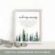 Projetado para combinar com nossa coleção de casamento Timber Grove, este sinal elegante de inverno florestal é perfeito para colocar em uma mesa de memorial ou exibição em homenagem aos entes queridos que faleceram. Personalize o cabeçalho e o texto do corpo (mostrado com "Em Memória Amorosa" e um breve poema), acentuado com uma borda inferior de pinheiros em tons de caçador e verde floresta.