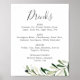 Este sinal de menu de bebidas de casamento com ramo de oliveira moderno é perfeito para um casamento boho. O design rústico, mas elegante, apresenta folhas verdes botânicas simples em aquarela e azeitonas pretas em um pequeno ramo com um sentimento mediterrâneo clássico.