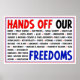 Afastem-se as nossas liberdades! Prepare-se para a próxima manifestação de protesto em nível nacional #50501, um evento local de defesa, ou vista/poste orgulhosamente este design a qualquer momento para defender o que importa. O texto diz: MÃOS DE NOSSOS corpos, escolas públicas, processo devido, Segurança Social, Saúde, Escritório de Posto, Direitos LGBTQ+, aliados, clima, imigração, livros, bibliotecas e museus, tratados e acordos comerciais, terras públicas, mídia, direitos de voto, neutralidade da rede, esportes, veteranos, ciência, economia, vacinas, PBS & NPR, línguas, pesquisa, cidadania, limites de termos, DEI, privacidade de dados Medicare & MédicoAid, liberdade religiosa, NASA, sindicatos, acessibilidade, casamentos, liberdade de expressão, parques, meteorologia, história, Constituição, LIBERDADES!