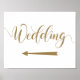 Dourada placa de casamento com seta para a esquerda para apontar convidados na direção certa