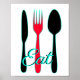 Esta poster é preta, branca, vermelha e lacerada com o texto "Coma", com um gráfico de garfo, faca e colher. Um visual moderno vai adicionar um pop de cor à sua cozinha.
