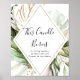 Este sinal de vela queimada geométrico tropical dourado é perfeito para um casamento de destino. O design apresenta folhas de palmeira e banana pintadas à mão em aquarela dourada e verde com flores cor-de-rosa agrupadas em buquês, adornando uma moldura geométrica.